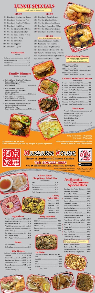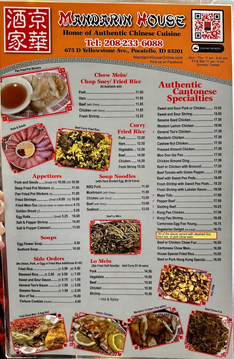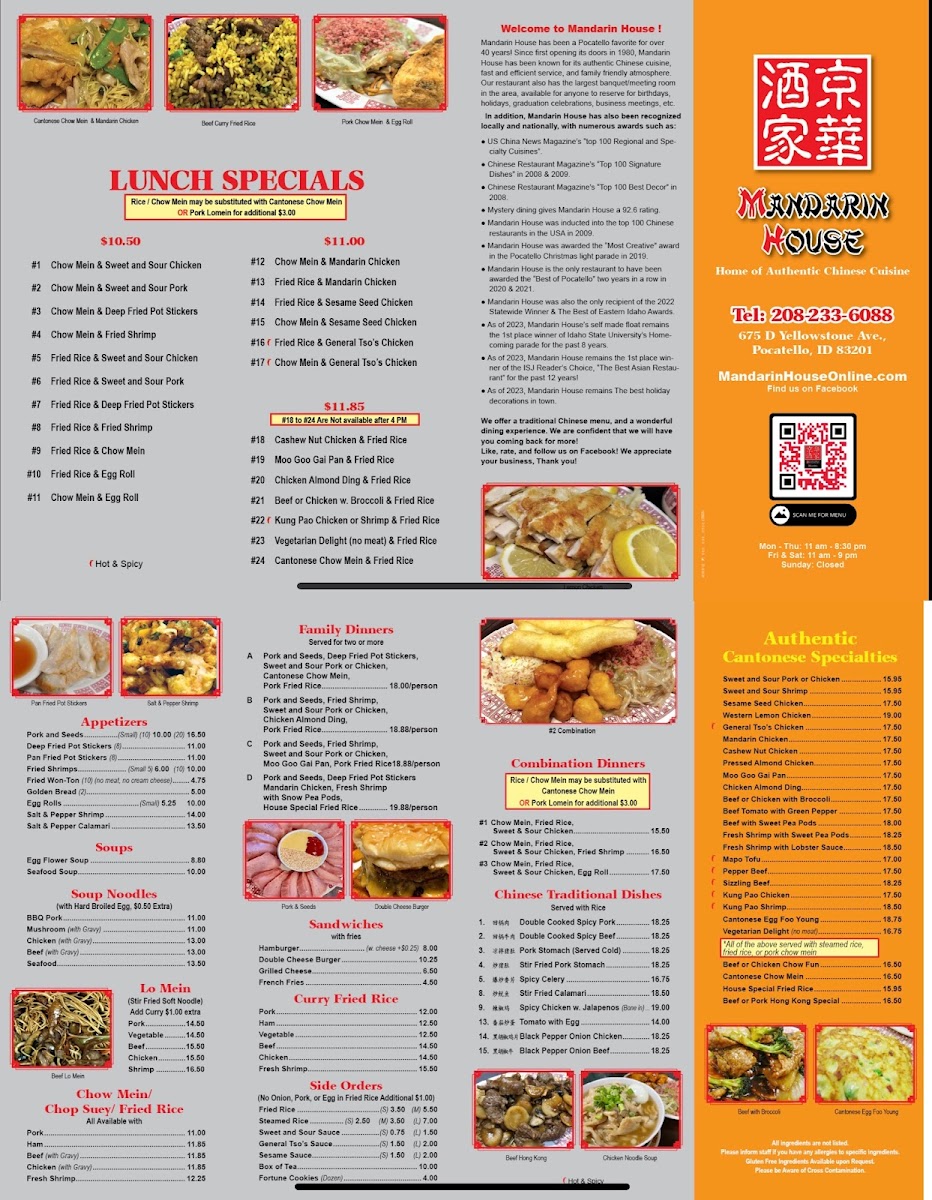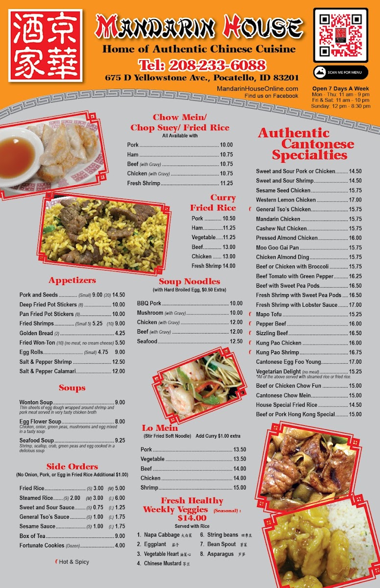 Welcome to Mandarin House of Pocatello, where authentic Cantonese cuisine meets warm hospitality. Located at 675 Yellowstone Ave, this delightful eatery offers a menu that showcases the rich flavors of traditional Chinese dishes. Signature items like the House Special Fried Rice ($15.95) and Pressed Almond Chicken ($17.50) highlight the restaurant's commitment to quality and authenticity.