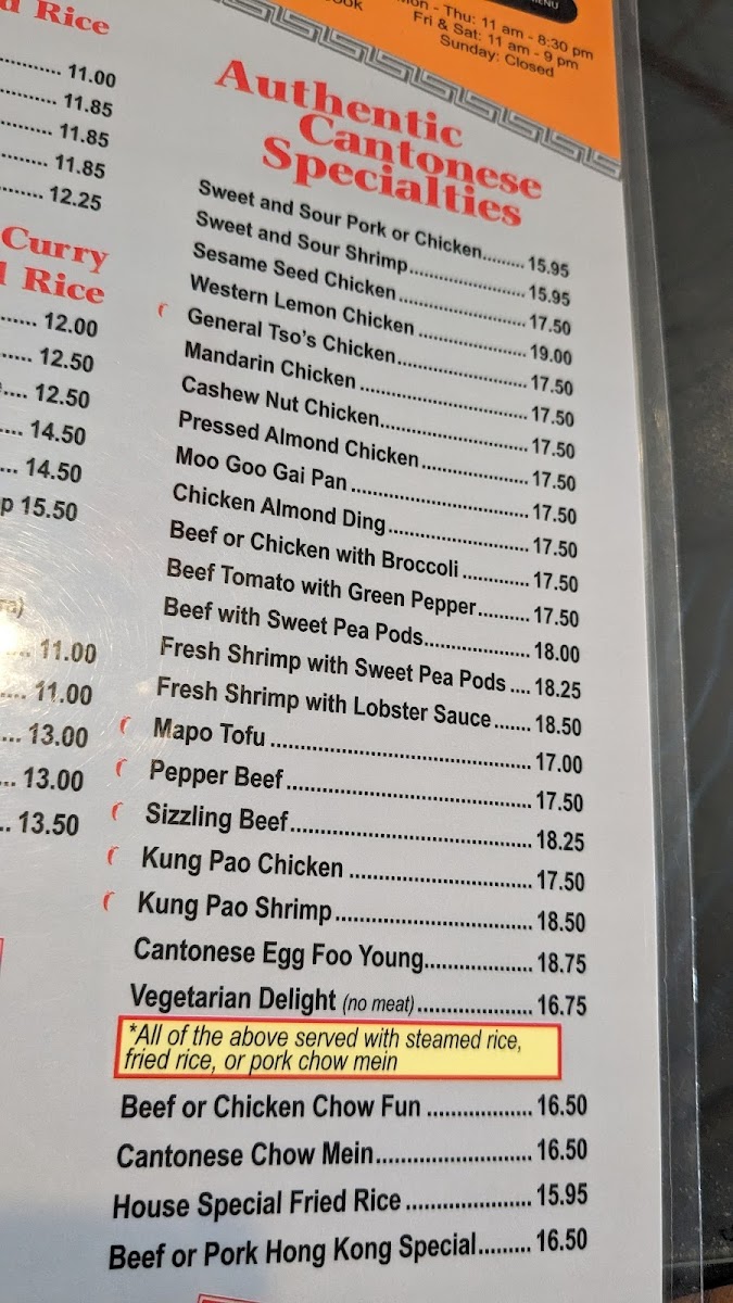 Guests rave about the Sweet and Sour Pork ($15.95) and the Pepper Beef ($17.50) for their rich flavors and fresh ingredients. Reviews reflect a family-friendly atmosphere, with servers like Kevin ensuring every diner feels valued. Patrons appreciate the cozy ambiance, perfect for both takeout and dining in.